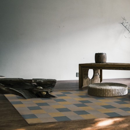 Una simple combinación de cuadrados puede ser la alfombra ideal sin combinan colores tan de moda y que nunca habrías imaginado juntos como el: topo, el mostaza y el azul cerceta. Este diseño tiene tanta personalidad que por sí solo hace singular la decoración más minimal.