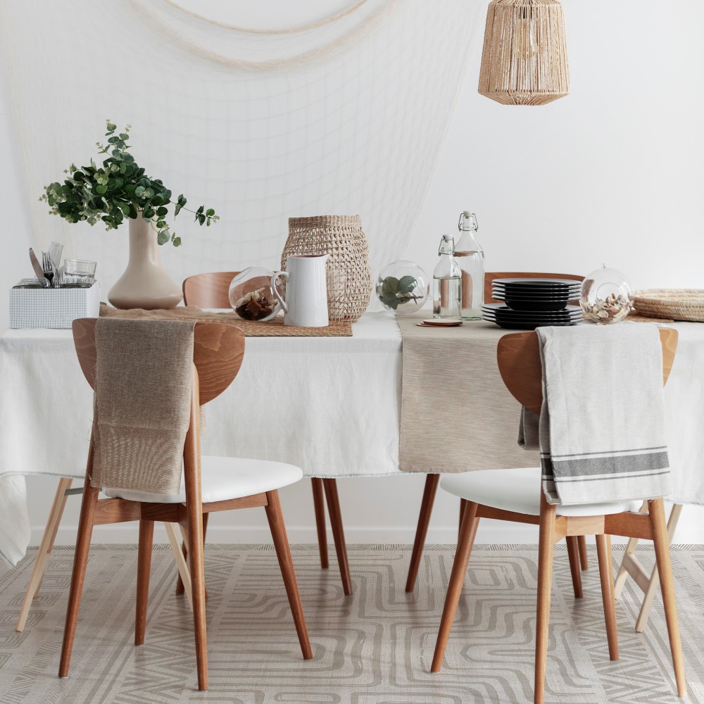 Después está el suelo. Muchas casas en España arrastran pavimentos antiguos, oscuros o visualmente fragmentados que rompen esa sensación de calma. Un suelo vinílico en tono madera clara o piedra suave ayuda a unificar y aportar continuidad sin meterse en reformas largas. Y si no se quiere intervenir toda la superficie, una alfombra vinílica de gran tamaño bajo el sofá o la mesa de comedor puede delimitar y recoger el espacio de forma muy natural.