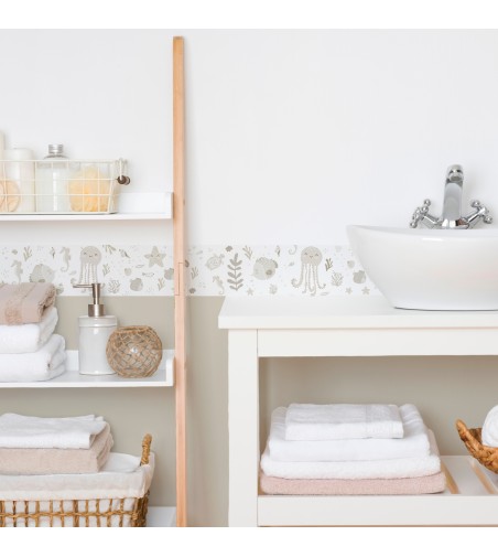 Divertidas ilustraciones de animalillos del fondo del mar en mono tono, muy actuales que transforman el baño en el nuevo lugar favorito de los más peques de la casa.