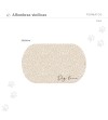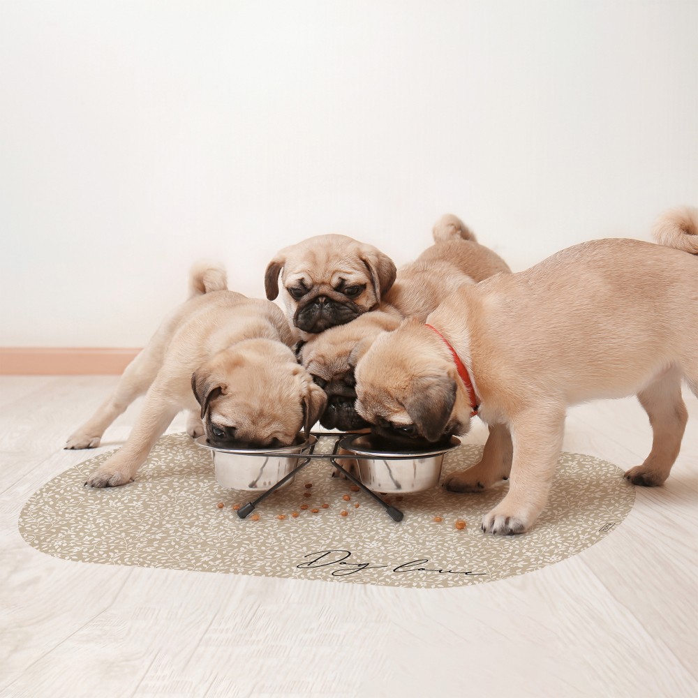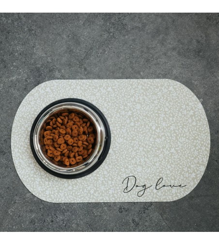 La alfombra comedero COBA,  es uno de nuestros preferidos, por la dulzura de sus colores, por el estampado floral inglés que tanto se lleva, y por su adorable forma de hueso. Sin duda, su precioso tono arena y sus diminutas flores blancas hacen que este diseño sea uno de los preferidos del equipo, y seguro que de tu mascota también. En medio lleva escrito con trazo manual y tipografía negra  "Dog Love" . Este estampado está disponible con forma de hueso, busca el modelo BONES