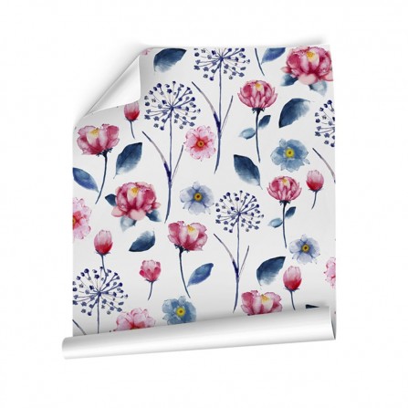 Papel pintado autoadhesivo de dulces flores con tonalidades que combinan con los collages de la colección. Azules, rosas, corales para un resultado femenino, elegante y muy actual.