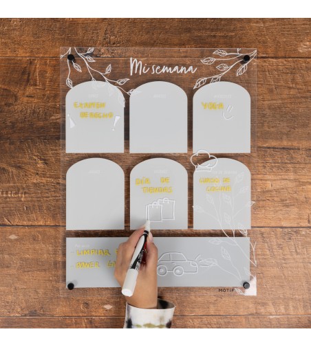Bellos planificadores de metacrilato. Pensados y creados para que además de organizarte, puedas sentir confort mental y visual. Con el podrás planificar tu semana, repartir tareas en casa, tener a la vista la lista de la compra, o componer tu menú semanal.