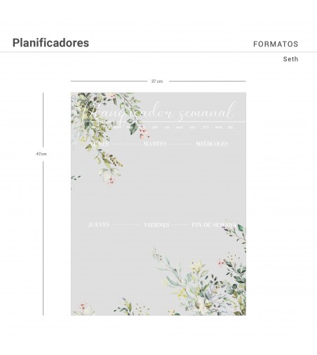 Precio 69,00 € In stock Planificador de pared menú semanal GenyaPlanifica todas las comidas de tu semana con nuestro planificador de menús semanal Genyal, adornado con preciosos motivos florales en tinta blanca. Medidas: 71cm de ancho por 48cm de alto. *Incluye cuatro embellecedores negros.Marca: Motif